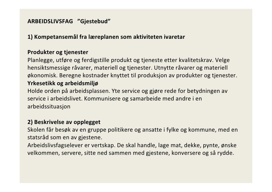 Juni med halve trinnet den 2. Arbeidslivsfag skal bidra til at elevene opplever at praktiske og organisatoriske ferdigheter verdsettes og anerkjennes. Vurderingskriterier Kjennetegn på måloppnåelse Arbeidslivsfag Kantinedrift 5-6 4-3 2-1 Hovedområde.