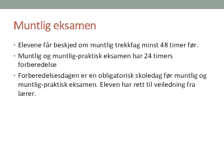 Muntlig eksamen skal ha 24 timer forberedelse og eksaminasjonen kan vare inntil 30 minutter pr. Ved individuell eksamen skal hele muntlig vare inntil 30 minutter mens ved gruppeeksamen beregnes det mer tid inntil 30 minutter per elev. I dette avsnittet hjelper vi deg med å få mest mulig ut av forberedelsen til eksamen.