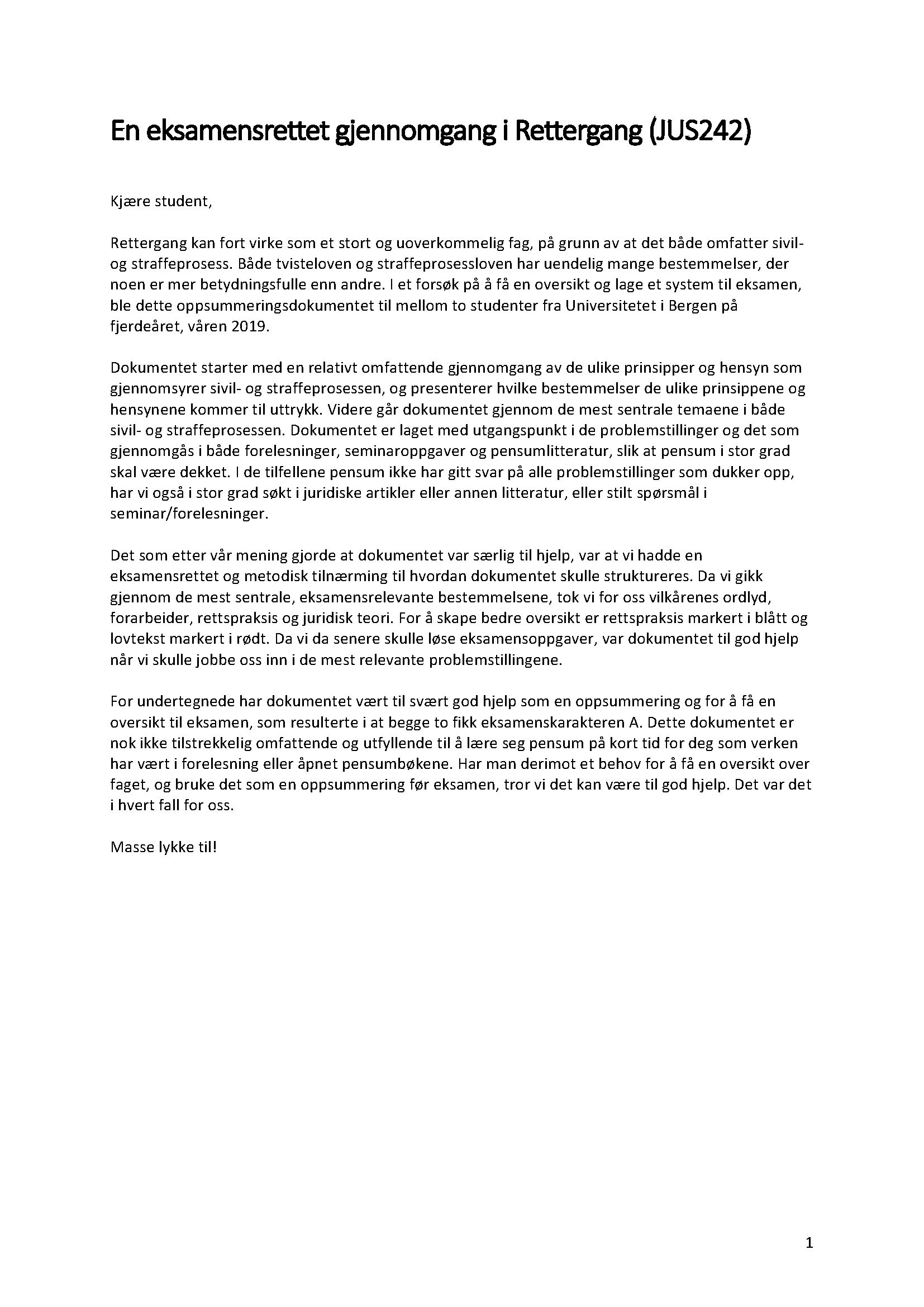 UNIVERSITETET I BERGEN Eksamen i prosessrett 4. NOK 3500 Kjøp nå Gå til kassen Lagt i handlevognen. Dokumentet er en eksamensrettet gjennomgang av pensum i faget Rettergang JUS242 og ble skrevet av to studenter som begge fikk A på eksamen våren 2019.